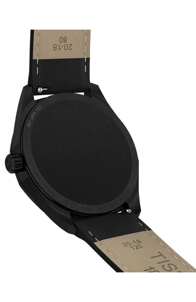 Ανδρικό Ρολόι Tissot Ελβετικής κατασκευής από ανοξείδωτο ατσάλι με μαύρο καντράν δερμάτινο λουράκι με ηλιακη ενεργεια.