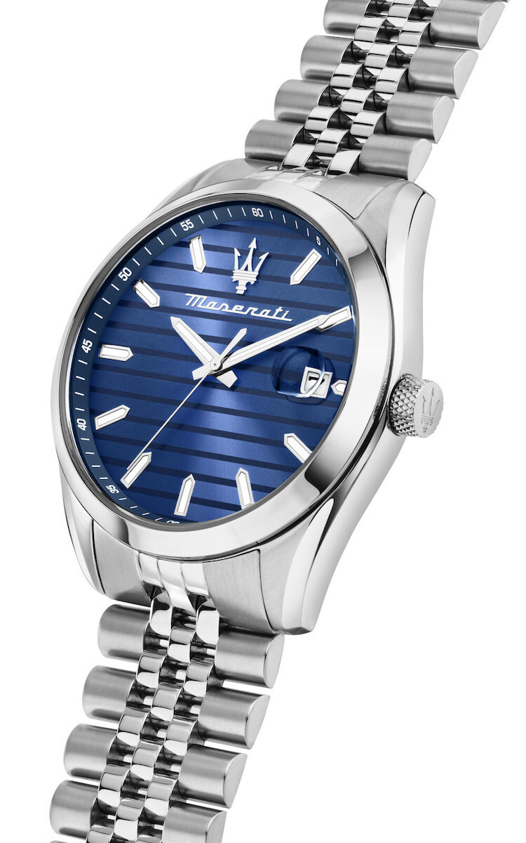 Ανδρικό ρολόι MASERATI ATTRAZIONE R8853151028 διαμέτρου 43mm, με μηχανισμό Quartz Ακριβείας, μπλε καντράν, κάσα και μπρασελέ από ανοξείδωτο ατσάλι.