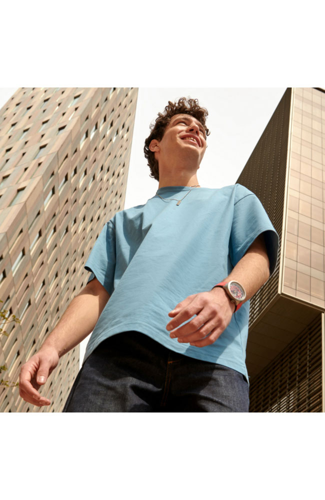 SWATCH με κόκκινο καντράν και δείκτες που φωσφορίζουν στο σκοτάδι σε μεταλλική αμμοβολισμένη κάσα.