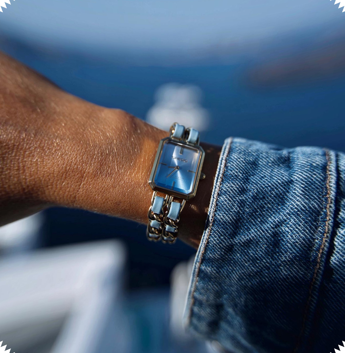Γυναικείο ρολόι Gregio από επιχρυσωμένο ανοξείδωτο ατσάλι με γαλάζιο όμπρε καντράν και χρυσό μπρασελέ, αγκαλιασμένο από γαλάζιο δερμάτινο λουράκι.